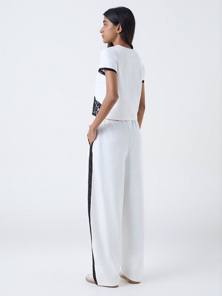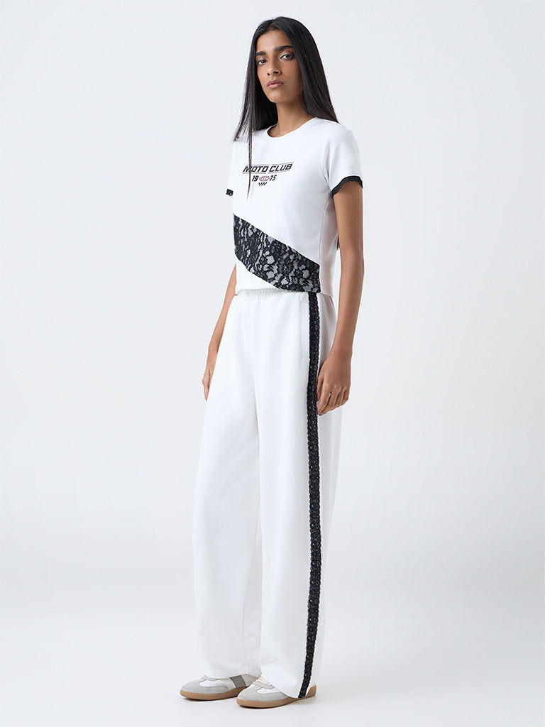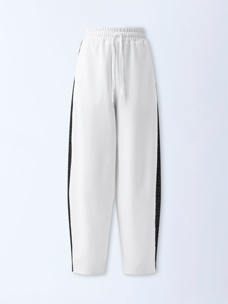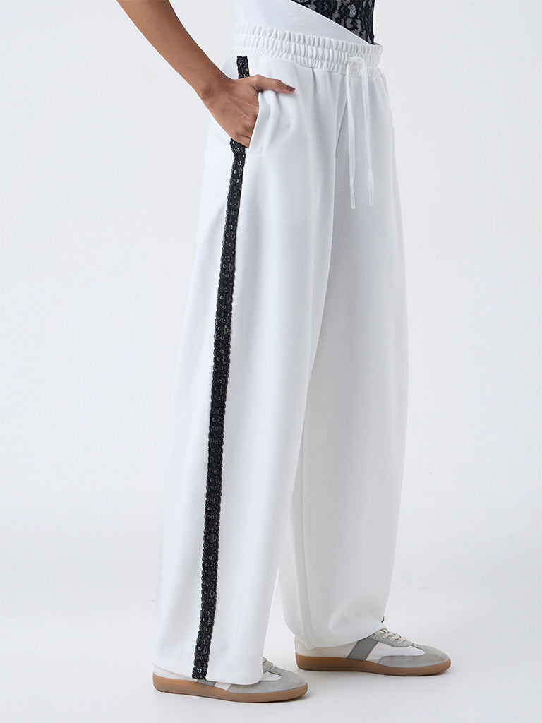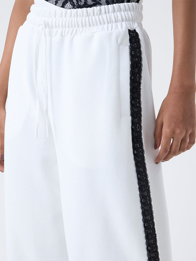 White pants that fuse comfort with subtle detailing. Built from high-quality fabric in a high-rise, they feature lace panels on both sides for a hint of texture. An elastic waistband with adjustable drawstrings and side pockets completes the look, making them perfect for relaxed yet stylish wear.