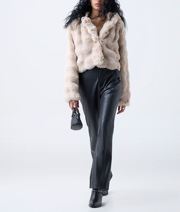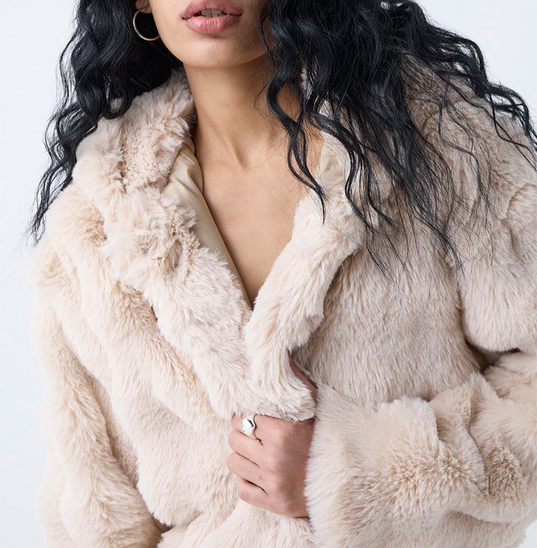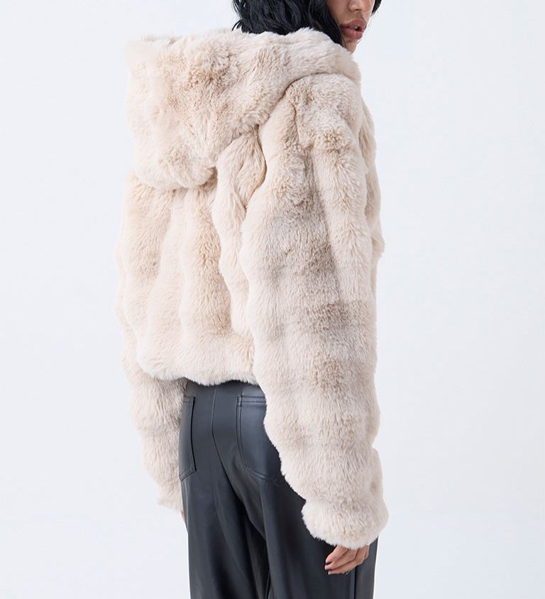 Nuon presents this beige fur jacket designed with a hooded neck for added warmth and style. Detailed with a snap-button front and full sleeves, it offers a plush feel and cozy comfort. A stylish layer for cooler days, it pairs effortlessly with casual and weekend looks.